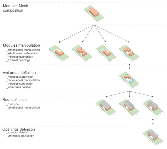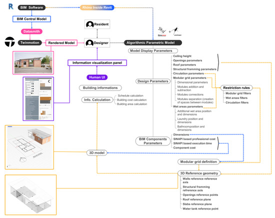 Therefore, this study assumes that the combination of BIM with algorithmic–parametric modeling technology can facilitate the MC of housing units by assuming two roles: (1) providing input data that feed the processing of a parametric algorithm and (2) serving as an algorithmically designed responsive central model, enabling simultaneous information sharing across disciplines.