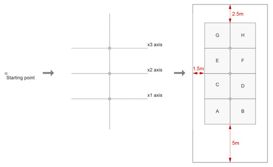 The house design consists of a modular grid of eight parametric modules. This grid defines the building footprint, with the recommended setbacks, as per local urban legislation. These setbacks include a minimum frontal (5 m), lateral (1.5 m), and rear (2.5 m) distance. The number of modules was defined based on subdivision tests that considered lot sizes (10 m × 25 m) and proportions and the ease with which users could manipulate the modules to create spatial configurations. The placement of the modules determines the massing and floor plan layout. The intersection of a central guide axis (y) and three perpendicular axes (x) establishes the origin points of the modules, arranged in pairs: AB, CD, EF, and EG. The longitudinal arrangement of the modules aims to adhere to the proportions of the existing lots, maximizing land usage and providing a clear indication of potential house expansion (Figure 3).