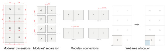 Modules’ parameters and primary operations: Capital letters label the modules within the grid system. Solid lines outline selected modules or rooms, while dashed lines represent areas of the grid that remain unbuilt. Source: the authors.