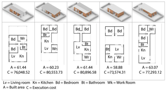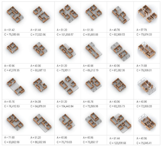 An array of MC housing design solutions using the developed model. A = constructed area of projects in m2; C = construction cost estimate, based on SINAPI references in BRL currency. Source: authors.