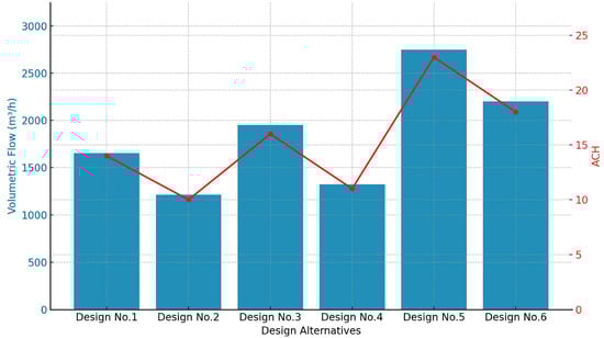 - The average air velocity at the inlet area for the flat-bottom airfoils in the quadruple group was 0.11 m/s, the lowest among the evaluated design alternatives. This design produced only 10 ACH, the minimum air circulation rate for the studied unit.