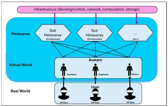 The term “metaverse” was first introduced by Neal Stephenson in his 1992 science fiction novel Snow Crash, where it is depicted as an expansive VR space shared by millions of users [9]. Today, the metaverse is recognized as a broad digital ecosystem composed of multiple immersive VWs that coexist alongside the physical world. These virtual environments enable users to engage in a variety of activities, including social interaction, entertainment, education, and commerce, all facilitated by advanced digital technologies [10,11].