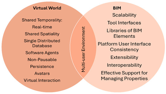 The overlapping region signifies the multi-user environment, where attributes from both domains converge to enhance collaborative workflows. This integration ensures seamless communication and functionality, combining the real-time and spatial aspects of VWs with the structured and data-driven attributes of BIM systems.