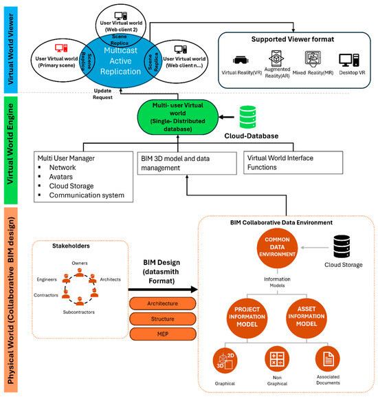 Proposed system architecture for developing a BIM-based Virtual World (VW), enabling real-time collaboration, data integration, and immersive interaction across multiple user roles.