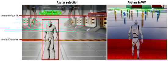 The avatars developed in this research serve to identify real-world users, with each avatar assigned a unique ID. Each avatar is equipped with a menu featuring various functions designed for communication and interaction within the VW as seen in Figure 6. These include video/voice chat, interactive visualization of BIM content such as BIM objects and data, a material changer function for visualizing different materials, as well as annotation and measurement tools. Figure 6 shows the virtual avatars within the VW.
