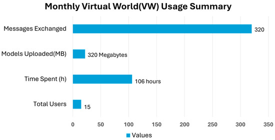 A one-month user trial demonstrated the system’s effectiveness for collaborative design. Fifteen participants (ranging from novice to expert VR users) collectively logged over 106 h in the VW, uploading 27 distinct BIM models (from SketchUp, Revit, Rhino) and exchanging roughly 320 messages. In follow-up surveys, users overwhelmingly highlighted BIM data visualization and multi-user interaction as the platform’s most valuable features. They also provided constructive feedback—for example, suggesting enhancements in model navigation, personalized user information, real-time revision control, and data export functions—which will guide future refinements.