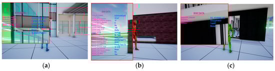 Additionally, Figure 12a–c illustrates the visualization outcomes of BIM data from different users within the VW. The table details the file formats, levels of detail, and corresponding visual representations of the models after conversion to the .udatasmith format, which facilitates their integration into the VR environment.