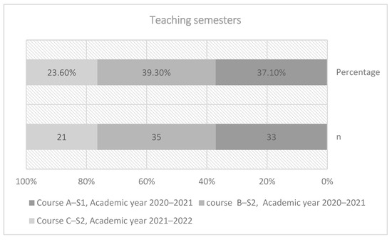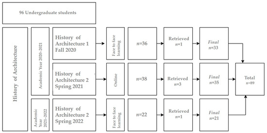 Over the three teaching semesters (Figure 1), the majority of participants (n = 89) were in their second year of the five-year undergraduate degree program in architecture. The age range of the students was 19 to 21 with a mean age 19.28. Of the total number of participants, 61.8% of the students were female, and 38.2% were male (Table 2).