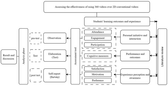 To investigate the assessment variables of the study, various research instruments were used to collect study data based on the reviewed studies. These included systematic observation [16,55], tests [38], and structured questionnaires (post-test) [9,13,36]. Together, these instruments were used to assess students’ performance and outcomes, engagement and participation, and overall learning experience (Figure 5).