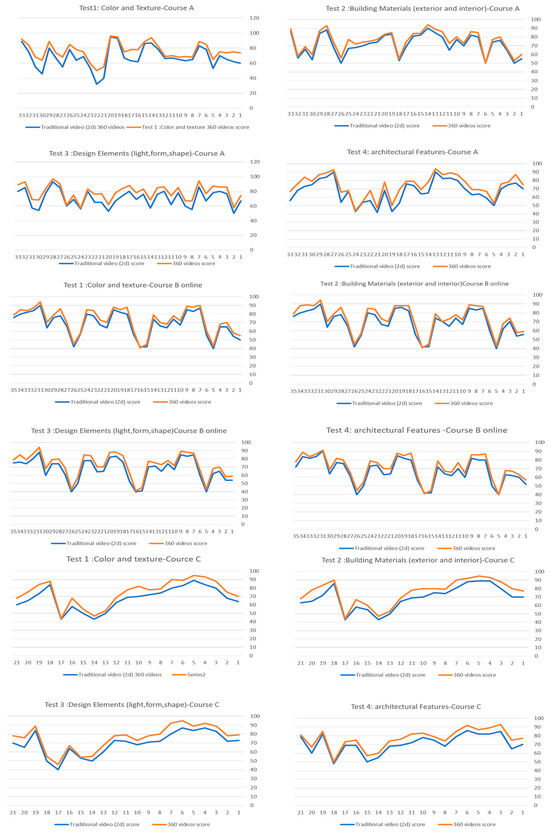 At the end of the three courses, final tests were conducted. Each test consisted of four types of questions on spatial cognitive variables: color and texture, design elements, building materials, and architectural features. To provide a fair comparison of results, the questions comprised an equal number of buildings from both 360-degree and 2D video lectures during the semester.