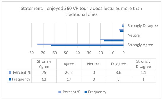 In addition to feeling motivated, students enjoyed using the 360-degree videos over the traditional ones in their learning process. Over 90% of responses expressed their enjoyment of using this tool more than they did 2D videos. Fewer than 5% did not enjoy it (Figure 7).