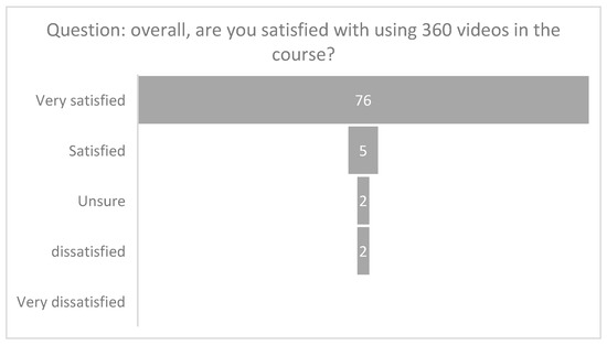 According to the responses to the questionnaire, more than 90% of the students were satisfied with using 360-degree videos. A total of 2.4% of them responded with uncertainty and 2.4% felt dissatisfied (Figure 8). Ultimately, the vast majority of students strongly advocated using 360-degree videos in other architectural classes (Table 16).