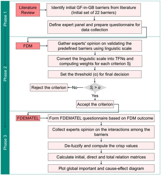 First, barriers to GF-in-GB were extracted from an extensive literature review. Then, an interview was conducted with two experts with at least ten years of industry and/or academic experience in GB finance. This was intended to refine the barriers regarding their clarity, relevance, practicality, and validity in the study context []. Secondly, the FDM was employed to select the critical barriers based on the case of Ghana. The FDM approach presented here was structurally designed to assess the list of pre-screened barriers extracted from the literature review and through the expert panel interview. Finally, the cause–effect interrelationship of the barriers was obtained by using the FDEMATEL.