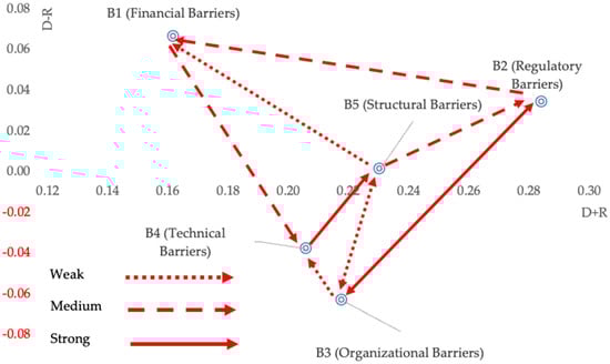 Barriers with high global importance indexes are also referred to as high prominent index barriers. These barriers have the potential to influence or be influenced by other barriers and, hence, need critical attention, particularly in the short term [,]. Regulatory (0.284) and structural barriers (0.230) emerged as the two barriers with the highest global importance indexes.