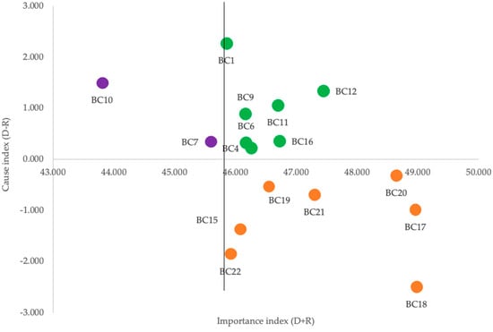 Figure 3 shows that the (D − R) axis differentiates between the cause-and-effect groups, while (D + R) indicates the importance or prominence of the indicators. The causal group indicators are on the positive side of the (D − R) axis, while those on the negative side are effect groups. The barrier indicators include inadequate private investment (BC12), inadequate management support (BC11), and limited green projects (BC16).
