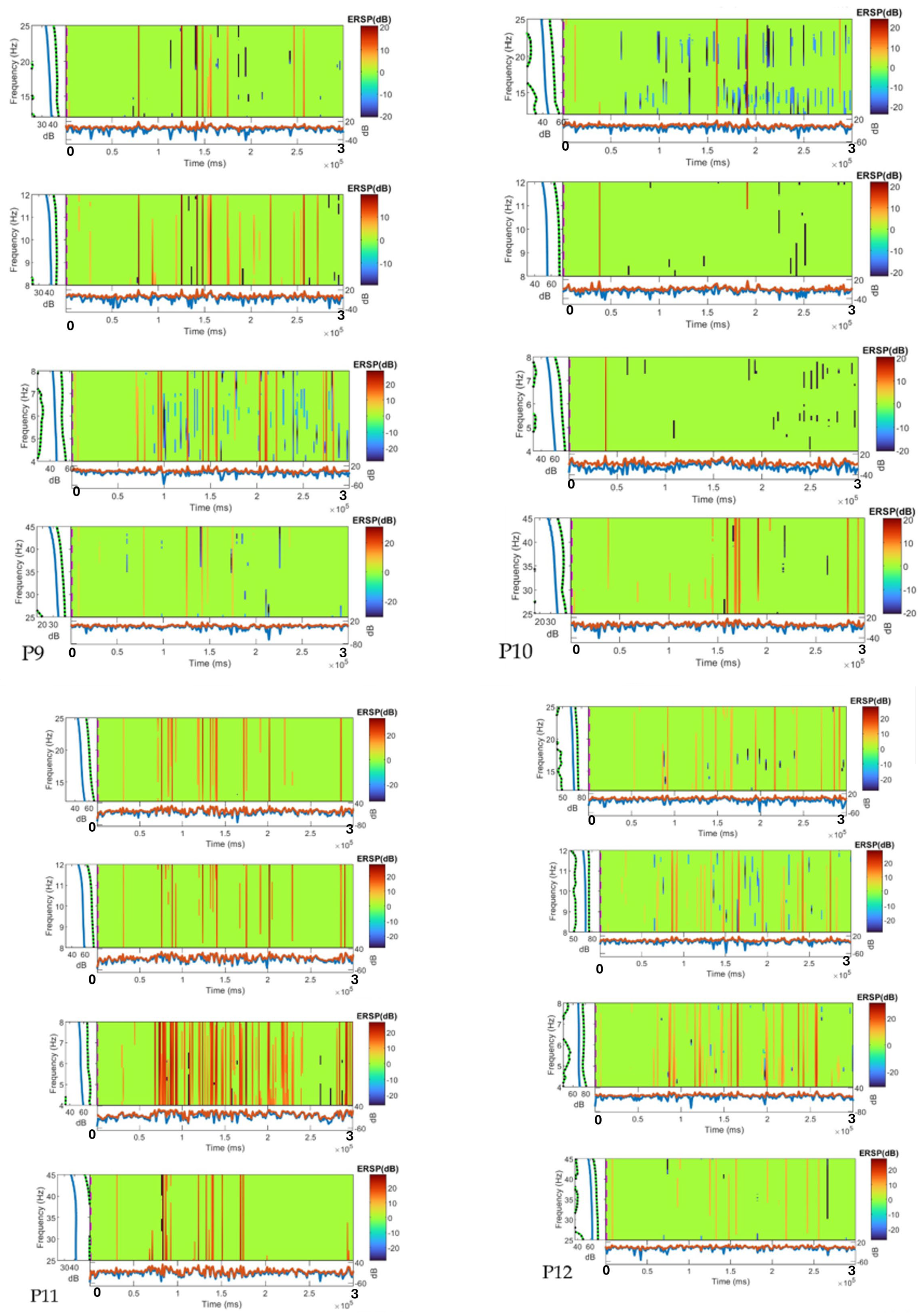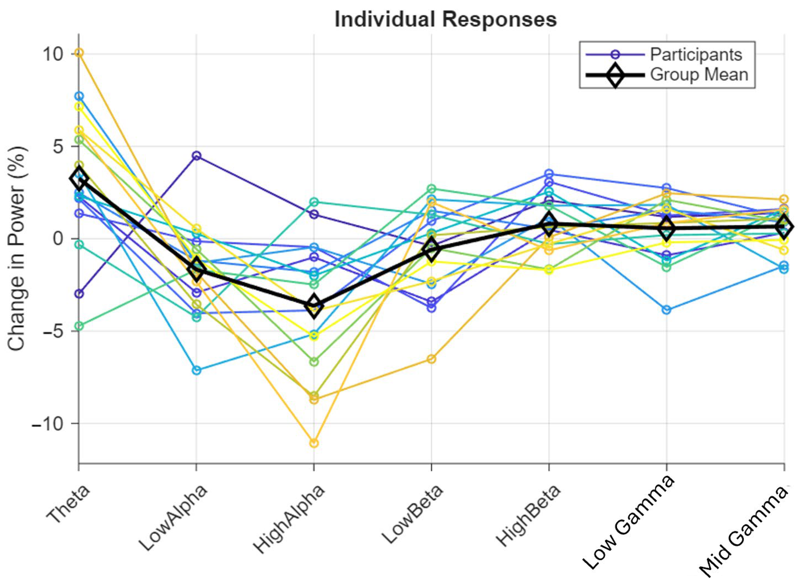 - Individual Responses (Figure 10): This line graph displays the percentage change in power for each frequency band (Theta to MidGamma) across multiple individual responses (different colored lines). The changes vary widely, with some bands (e.g., HighAlpha) showing significant decreases, while others (e.g., LowGamma) show more stability.