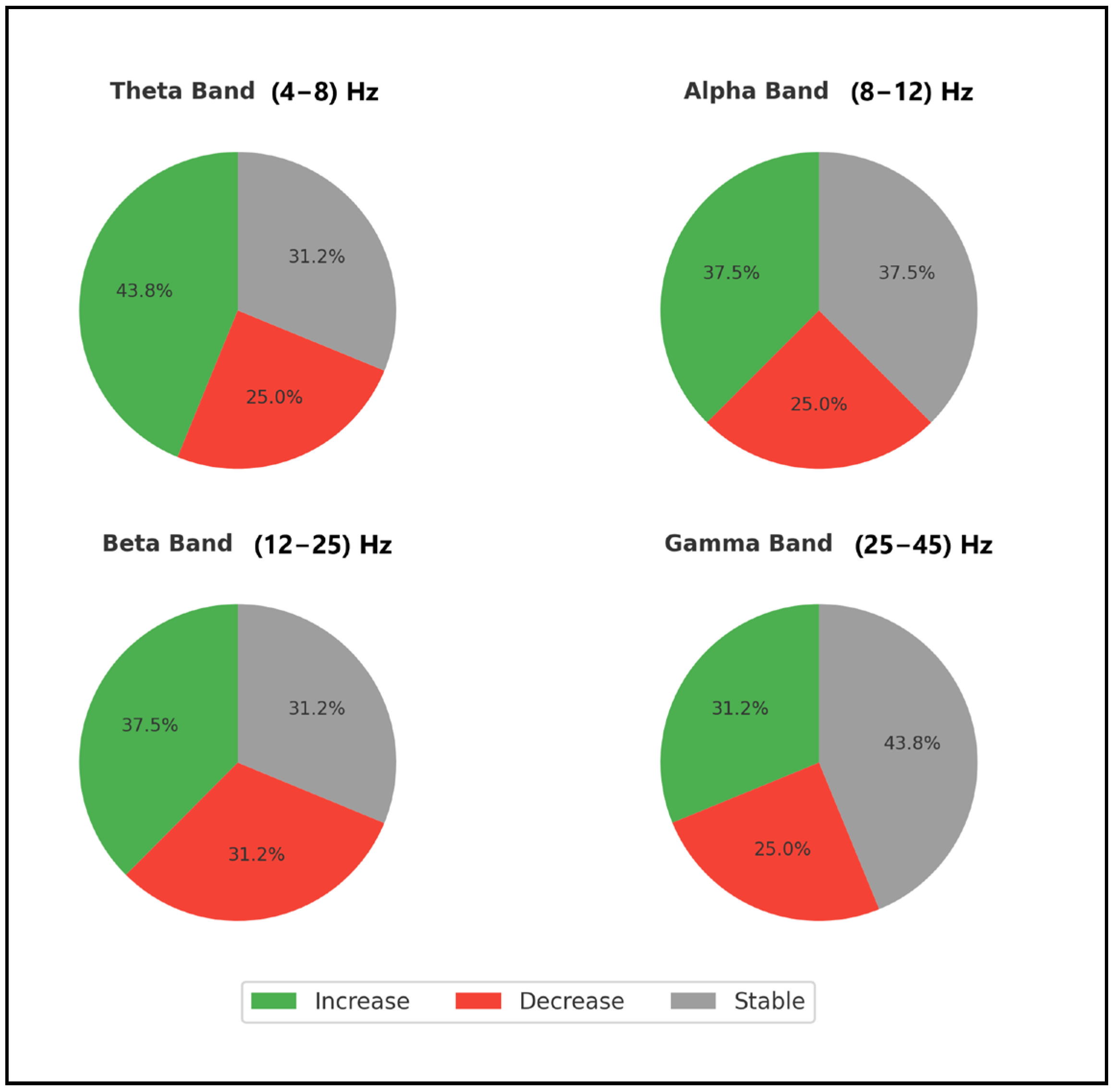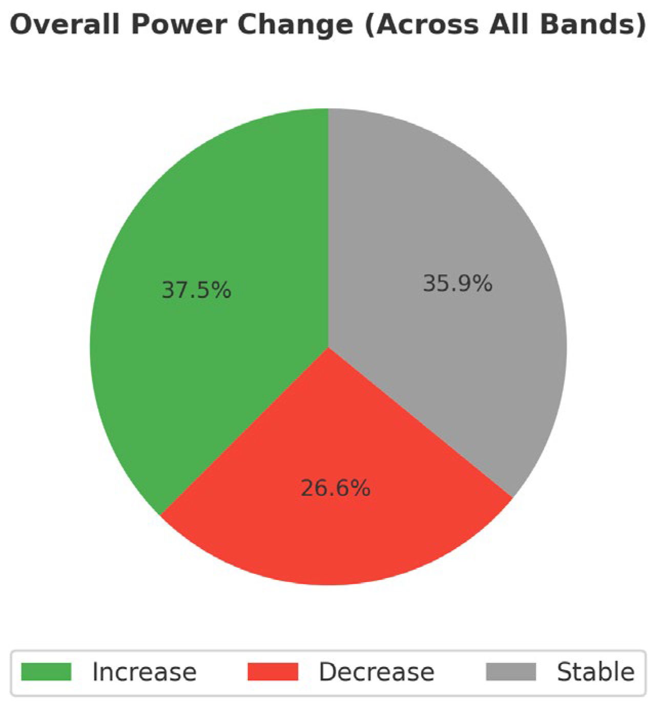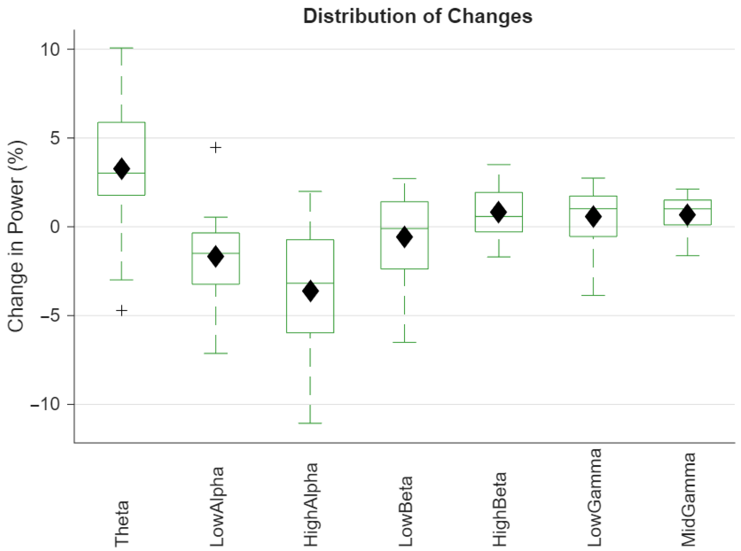 - Distribution of Changes (Figure 9): This box plot shows the distribution of percentage changes in power for each frequency band. The median changes are close to zero, with Theta and LowAlpha showing the widest distributions (both positive and negative outliers), while MidGamma has a narrower range and a slight positive shift.