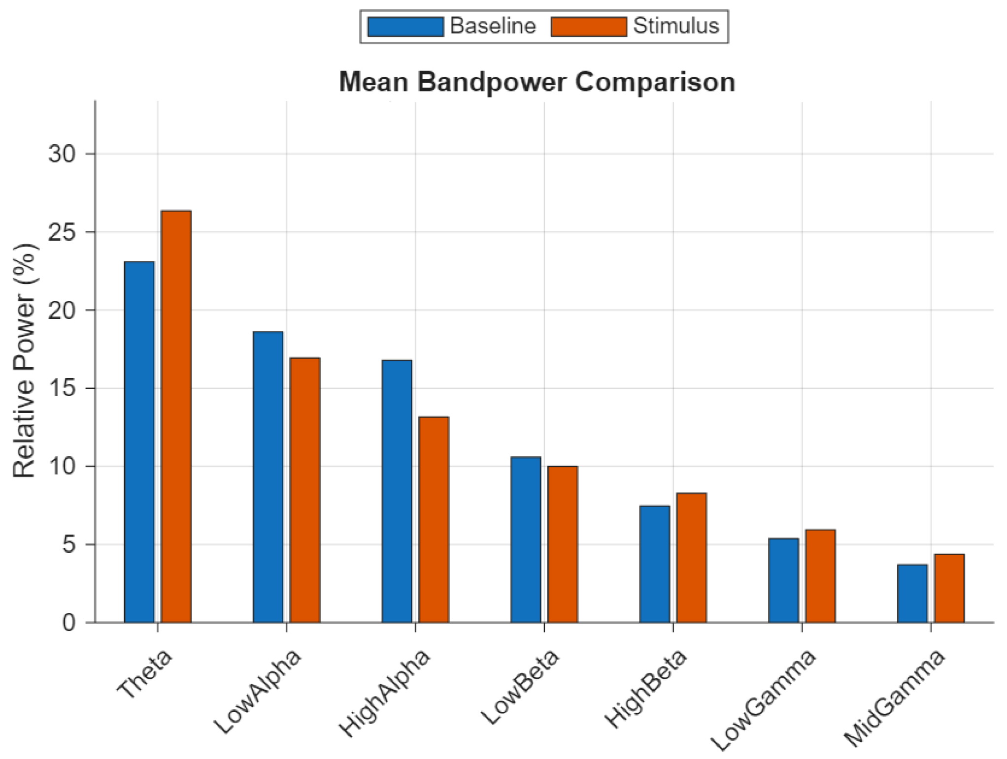- Mean Band power Comparison (Figure 8): This bar chart compares the mean power (%) across different brain frequency bands (Theta, LowAlpha, HighAlpha, LowBeta, HighBeta, LowGamma, MidGamma) under two conditions—baseline (blue bars) and stimulus (orange bars). Theta and LowAlpha show the highest power, with stimulus slightly increasing power in Theta and decreasing it in LowAlpha and HighAlpha compared to baseline.