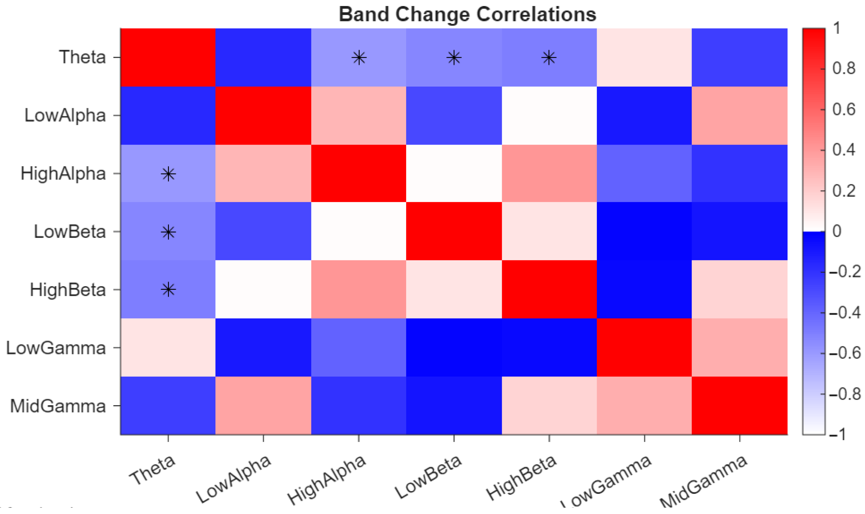 - Band Change Correlations (Figure 11): The correlation matrix illustrates the pairwise relationships between stimulus-induced power changes across EEG frequency bands in the study cohort. In this visualization, red indicates positive correlations (0 to +1), signifying that power changes in paired bands co-vary in the same direction, while blue denotes negative correlations (−1 to 0), reflecting inverse relationships where power increases in one band associated with decreases in another. The dark-red diagonal confirms the expected perfect positive autocorrelations (r = +1) for each band. For example, dark-blue, where “LowAlpha” meets “Theta,” means that participants who showed increased Low Alpha waves during the stimulus also tended to show decreased Theta waves. The asterisks (*) mark correlations that are statistically significant (less than 5% likely to occur by chance).