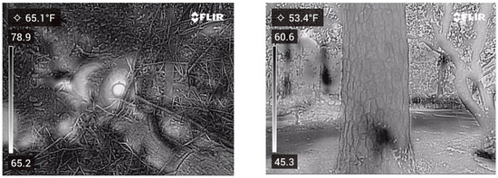 Designers get inspired by mechanisms in nature, including geometrical properties and cellular structures, applying them at different scales. For instance, one could investigate and compare how different types of trees respond to climate conditions in terms of the foliage (macro) and cellular structure (micro) of the components. Figure 2 explores the thermal behaviors of trees as a closed-loop system based on different temperature conditions in Tallahassee, FL, USA. The images are captured using an FLIR Thermography camera model C3-X (Teledyne FLIR, Wilsonville, OR, USA) with a Thermal Sensitivity < 70 mK. The images capture tree trunks with areas that show warmer spots closer to the center, and the second capture verifies the same observation on a day with higher temperatures. This observation indicated how the density of the tree bark responded to thermal conditions. The next observation explores the geometrical features of different types of tree foliage based on climate conditions as a means of translating natural adaptations into building enclosure indices.