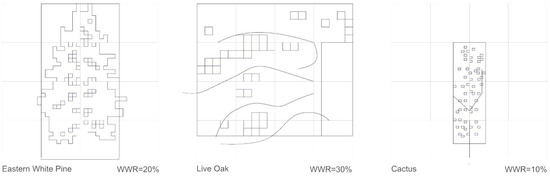 In this effort to translate the thermal behaviors of tree foliage based on the percentages of openings and shades in different climate conditions, we created abstract drawings of the elevation of specific types of trees. The root system is not presented in these drawings, as further investigation into water absorption and the mechanisms of the soil is needed. Figure 3 illustrates an observation of the density of the foliage as a counterpart to the window-to-wall ratio (WWR) in different climates. This illustration shows an abstraction of the areas of the tree foliage through which light penetrates on a quadrilateral grid, representing window-to-wall ratios. The comparison looks at eastern white pine, live oak, and cacti to categorize their openings based on the prevalent species for cold, hot–humid, and hot–dry climates. This observation also includes the depth of the live oak tree’s shade. The results indicate a WWR = 20% for pine trees in cold climates versus 30% for shaded live oaks in hot–humid climates and 10% for cacti pores in hot and arid climates.