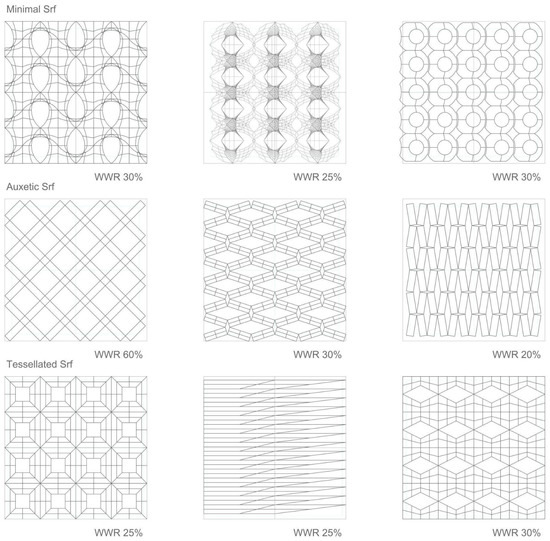 The first set of designs in this study is focused on minimal surfaces, where, in nature, such surfaces are a result of an equilibrium in tensions between boundaries [13]. A simple experiment to create minimal surfaces in nature is by making soap films. Figure 4 illustrates geometrical drawings for Gyroid, Costa, and Schwarz P surfaces using the Rhino 3D tool, where applying these surfaces to a building enclosure results in 30% window-to-wall ratios (WWRs). This illustration explains how WWRs are calculated based on the visual analysis of the openings that the geometries fabricate.