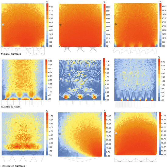 Beyond energy outcomes, Figure 6 depicts DA comparison results for optimal minimal, auxetic, and tessellated surface enclosures using the Honeybee tool. The Daylight Autonomy provides the percentage of time that the space meets a target illuminance (Reinhart). The Spatial Daylight Autonomy (sDA [300, 50%]) is a daylight availability metric that corresponds to the percentage of the space that meets the target illuminance of 300 lux values for 50% of the time [18]. The sDA results in this study indicate that minimal surfaces and the tessellations with 30% WWRs meet the 75% target level. Even though the auxetic surfaces with a high WWR were predicted to have a higher glare possibility, their daylight analysis responds to a lower value because of the geometrical density of the shaded opaque elements.