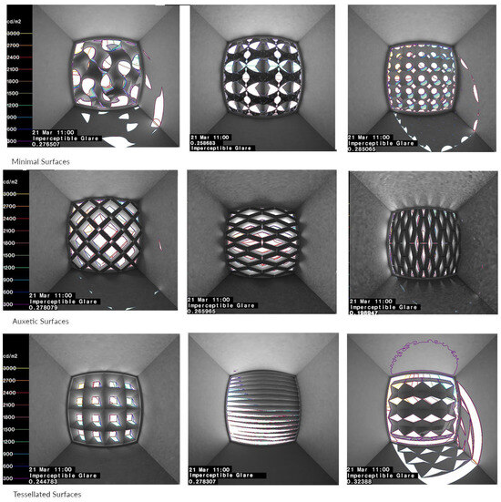This section explores different window-to-wall ratio scenarios for minimal, auxetic, and tessellated enclosure designs. Minimal surfaces explored in this study, Gyroid, Costa, and Schwartz P, represent 30% WWRs. Auxetic building enclosures could respond to different solar needs during the day and change mechanically or chemically in response to environmental factors (i.e., heat or light). Auxetics are explored in this study with a dynamic range of 30% to 60% window-to-wall ratios for auxetic surfaces, where case studies for different minimal and tessellated designs represent 25% WWRs, as they provide a more enclosed spectrum of surfaces. All simulations are performed using the same settings for the south-facing orientation, shading depth, materials, and climate-based daylight modeling with clear sky conditions in Tallahassee, FL, USA. Glass transmittance is set to 0.55 for all simulations, generic floor 20% reflectance, generic wall 50%, and ceiling 80%, using the angular fisheye for the glare view-based analysis.