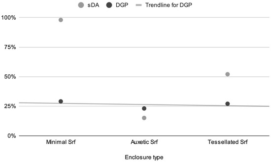 The chart in Figure 8 represents the relationship between enclosed surface types and the sDA/DGP, with the highest daylight outcome for minimal surfaces. The findings showed that minimal surfaces provided the most efficient combination of an sDA > 75% and a glare < 35% within the 30% WWR range. This work demonstrated a translation methodology between natural geometries and WWRs as building enclosures. The results, furthermore, provide building performance outcomes and comparisons for designers not to focus on form findings from nature but to search for climate-based translations based on the performance results.