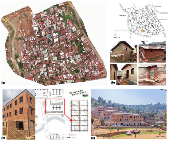 The building initiative in Akabahizi village, located in Rwanda’s Nyarugenge district, aims to upgrade informal settlements and improve living standards through urban planning strategies. Developed over four years, this project targets approximately 34,817 residents across 137 hectares, focusing on the Gitega sector of Akabahizi and nearby Kimisagara districts along the Mpazi River, including a 20 m buffer zone between drainage systems and residential areas for safety [61]. As depicted in Figure 1c, the existing buildings significantly differ from traditional informal structures. It presents the architectural design and elevation of this new typology, showcasing a compact, rectangular footprint with a structured layout that maximizes density, a stark contrast to the organic sprawl of traditional housing. These buildings feature a net floor area of 750 sqm in a G + 2 configuration, with 26–30 units per block ranging from small studios to four-to-five-bedroom apartments. Ground-floor rental units and small-scale commercial activities are included to promote income generation. The initiative emphasizes green sustainability, utilizing locally sourced materials such as white stones and bricks to enhance durability and reduce environmental impact, as well as improving energy efficiency [12,62]. Designed to accommodate larger families, the buildings can house over 80 individuals, addressing overcrowding issues. For instance, on 4 July 2022, housing units were allocated to 56 families.