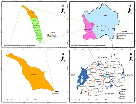 As detailed in Figure 2, Gitega is one of the 10 sectors that make up the Nyarugenge district in Kigali city. It is located at 1°57′16.9′′ S and 30°03′24.1′′ E, with an elevation of 1509 m. It has a population of 26,668 and a total surface area of 1.174 km2. The district comprises six cells: Akabahizi, Kora, Akabeza, Kigarama, Kinyanye, and Gacyamo. Akabahizi is our study area and is located at −1.9459° (or 1°56′45′′ south) and 30.052° (or 30°3′7′′ east), with an elevation of 1426 m. It is situated near the locality of Cya-hafi and the suburb of Nyarugenge. Akabahizi has approximately 17,000 inhabitants crowded into 124.7 hectares, resulting in a population density of around 139.4 inhabitants per hectare. The population is primarily composed of young and elderly adults, which influences housing needs and community dynamics [64].