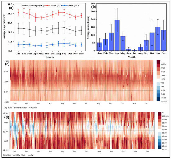 (a) Monthly average temperatures from 2018 to 2023; (b) the monthly average rainfall from 2019 to 2023, (c,d) yearly ranges of temperatures and humidities, respectively, in Kigali City, Rwanda.