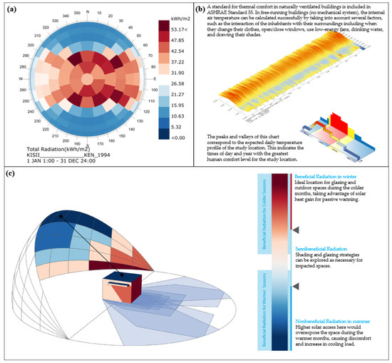 (a) The direction and intensity of solar radiation; (b) prediction of the internal air temperature and comfort levels every year around the cardinal points for Kigali City, Rwanda; and (c) radiation map projected onto a dome, which helps in designing buildings that are more energy-efficient and comfortable throughout the year.