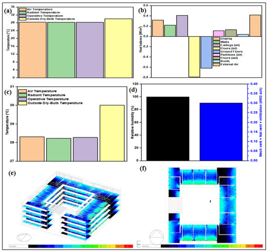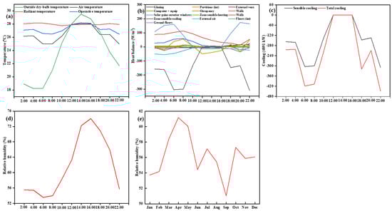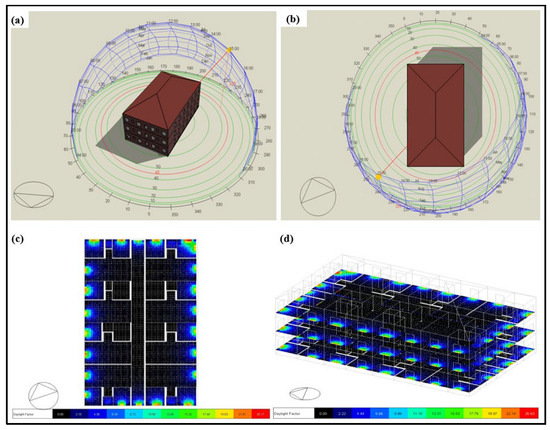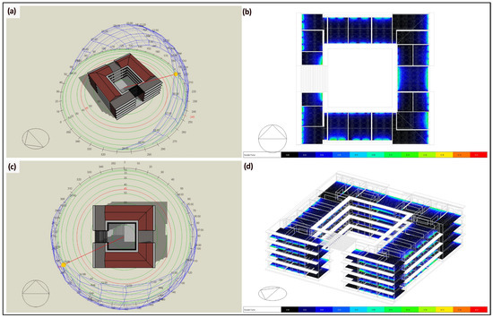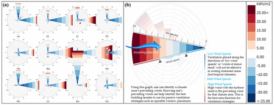 A comprehensive view of solar radiation patterns in Kigali City, Rwanda, using a sky dome format to illustrate the intensity of solar energy throughout the year, is presented in Figure 4a. It displays the cumulative solar radiation measured in kilowatt-hours per square meter (kWh/m2) across the cardinal directions: north, south, east, and west. The high radiation levels could reach above 53.17 kWh/m2 in the case of high solar exposure, and the low radiation levels reached below 5.32 kWh/m2 in the case of low solar exposure. Areas pointing towards the east exhibited higher values, often exceeding 42.54 kWh/m2, while regions facing north and west reflected lower levels (21.27 kWh/m2). The three categories of solar radiation levels, high, medium, and low, shown in Figure S13 provide guidance for optimal glazing placement and traditional shading strategies for enhancing thermal comfort in buildings. In order to maintain comfort, overhangs and skylights are recommended for high radiation levels; medium-radiation zones require additional heat, while low-radiation regions are suitable for glazing.