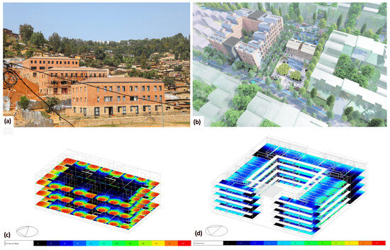 As depicted in Figure 1, the traditional buildings of the Akabahizi village in the Gitega Sector (Figure 1a,b) realistically illustrate the community’s economic limitations and traditions. Historically, residences in the area have been built with locally produced materials, including mud bricks and clay, supplemented by corrugated iron sheets for roofing. These materials are economical and easily accessible, making them practical options for the community. Traditional informal buildings in Akabahizi are often characterized by a rectangular shape, a single front entrance, and limited windows, frequently comprising only one near the door or none whatsoever (Figures S1 and S2). The roofs, constructed from corrugated iron sheets, are economical and easy to install, typically featuring a flat design with a slight pitch to facilitate rainwater drainage. This roofing material has drawbacks; it is prone to rust and corrosion over time, raising considerable durability concerns [32]. The living conditions in Akabahizi village are marked by informal housing that causes congestion [31]. The situation has been intensified by inadequate urban planning, leading to the emergence of settlements that developed spontaneously without formal regulations.