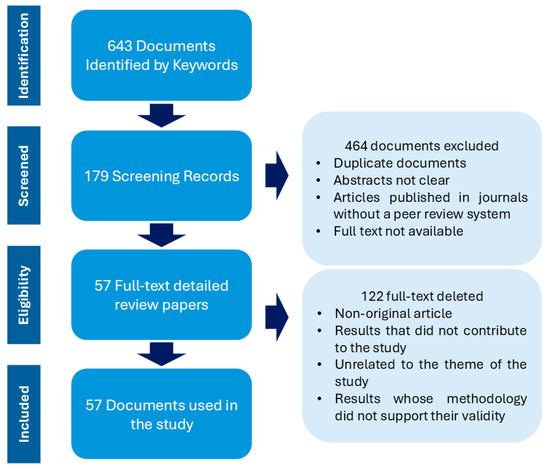 The research using the keywords returned 643 articles from the last 10 years, indicating the relevance of the topic addressed. The selection process followed the steps outlined in the PRISMA (Preferred Reporting Items for Systematic Reviews and Meta-Analyses) guidelines to select documents that explicitly addressed the use of BIM in smart buildings within the context of smart cities, with theoretical or practical contributions to potentiality and challenges, even if these terms were not explicitly defined.