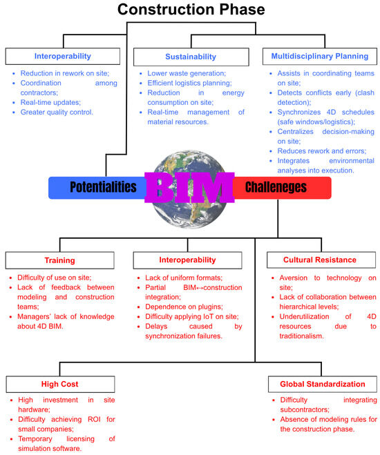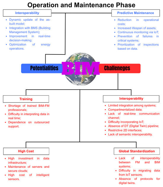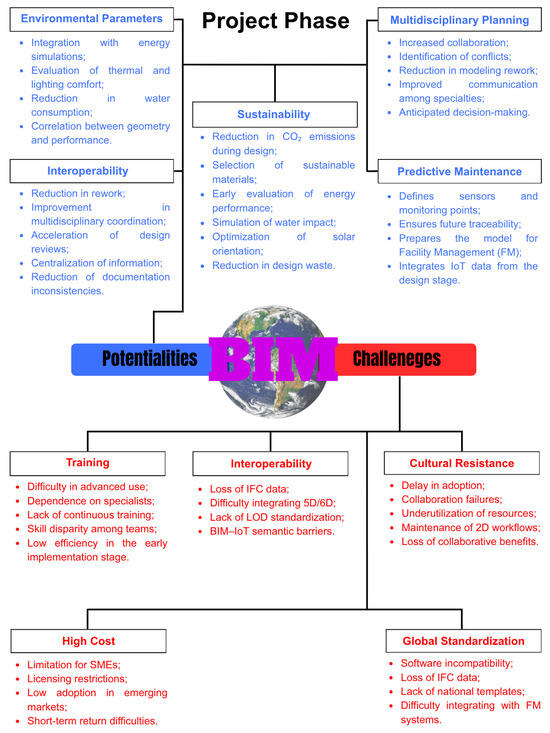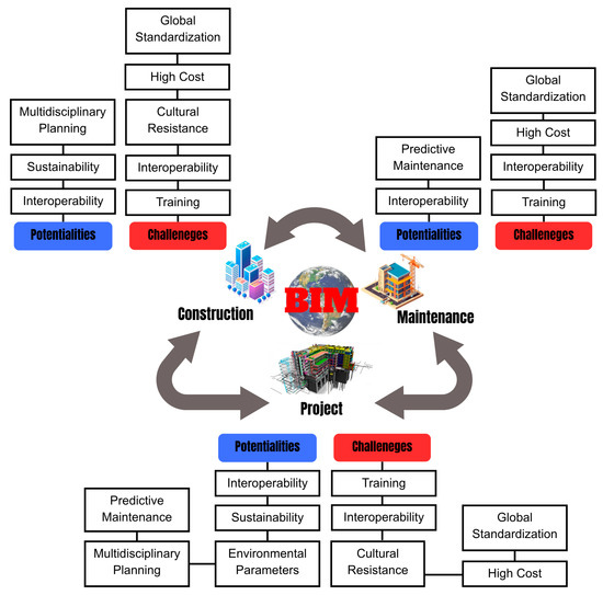 - The structuring by life cycle phases enables professionals to optimize the application of BIM at specific moments (design, construction, maintenance), based on the knowledge of which potentialities (such as performance simulations in the design phase) and challenges (such as interoperability or lack of standardization) are most relevant in each phase. It also helps professionals focus their efforts on the areas of greatest return and consolidated application (most cited potentialities) and those that require more attention, training, and protocol development (most cited challenges).