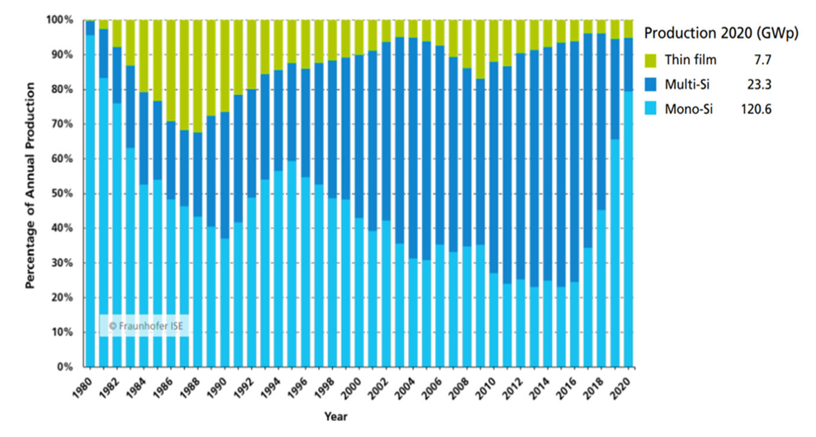 Table 5. Global market share and average price range of thin-film solar technologies [129,130,131].