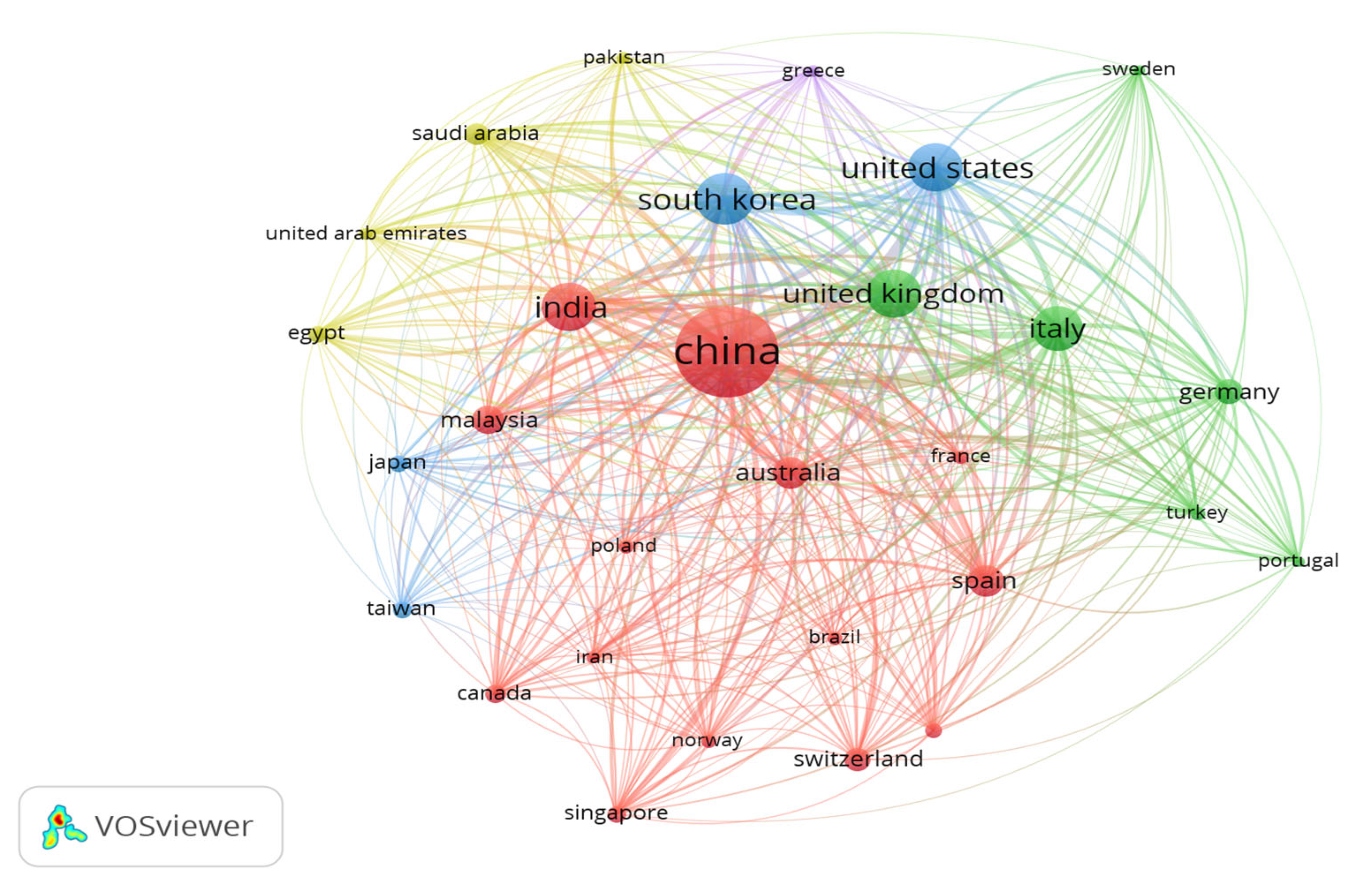 The cleaned dataset was then analyzed using VOSviewer, version 1.6.20, to build bibliometric and visual network maps. Country-level co-authorship networks were developed using VOSviewer, in which each node represents a contributing country, and the node size represents the volume of publications from each country. The thickness of the connecting links represented the strength of international collaboration, based on the number of co-authored papers, and color-coded clusters represented regional or thematic research collaborations. Association strength normalization was used as the method of normalization to ensure balanced representation of countries, while all other default parameters for visualization were kept in order to be able to present all countries with the least amount of noise from those countries contributing minimally. This has indeed helped in mapping important global research hubs such as China, India, the USA, and the UK, and also regional clusters in Europe and Asia that present high collaboration intensity with rapid research growth concerning BIPV technologies.
