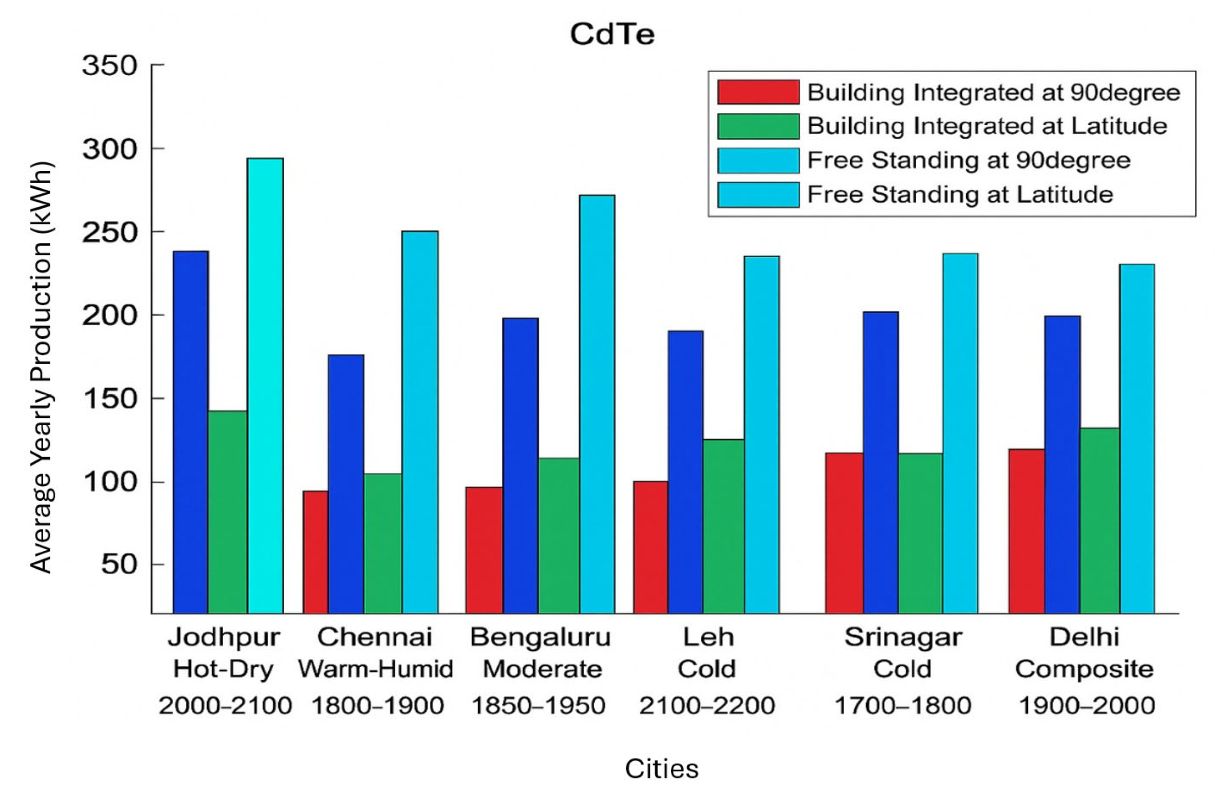 Figure 7. Average yearly electricity generation of CdTe-based PV systems across six Indian climatic zones (Jodhpur: Hot–Dry, Chennai: Warm–Humid, Bengaluru: Moderate, Leh: Cold, Srinagar: Cold, Delhi: Composite). The x-axis shows climatic zones with corresponding average solar (1700–2200 kWh/m2). CdTe modules perform best in high-irradiance regions such as Leh and Jodhpur. [76].