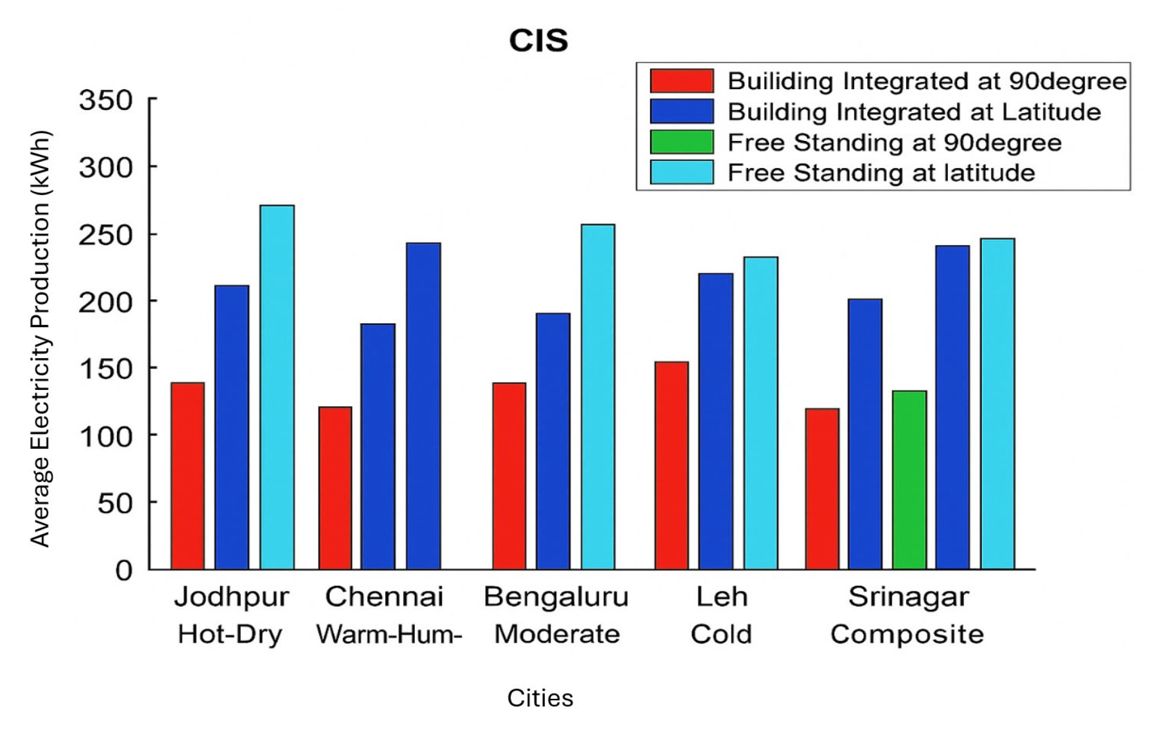 Figure 10. Average yearly electricity generation of CIS-based PV systems under different configurations across six Indian climatic zones. Energy yield increases with higher solar irradiance, indicating strong climatic influence on CIS module performance [90].