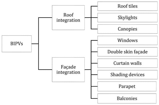 Energy efficiency in buildings refers to balancing all aspects of the building’s energy use by an optimized mix of passive design measures, efficient equipment, and integrated renewable sources of energy [7]. There is growing emphasis on harnessing solar energy as a key step toward concepts like zero-energy buildings, aligning with global efforts to achieve net zero emissions by 2050 [6,8]. In high-rise buildings, research has similarly identified the key parameters, including the design of the building envelope, building form, its orientation, and its height, along with ventilation strategies, carbon emissions, integration of renewable energy systems, and occupant behavior [5]. High-rise buildings, with their expansive façade area exposed to solar radiation, offer a valuable opportunity to utilize solar energy to contribute to its high energy demand. One of the promising strategies in this regard involves the application of BIPVs, as roof space is limited and vertical surface is more prevalent. BIPV modules are available in a range of colors, shapes, and transparency levels, which often come at the cost of reduced electrical efficiency. These customizations offer the possibility to either emphasize the PV cells as a design feature or integrate them subtly to improve the overall aesthetic and visual cohesion of the system within the building design [9]. As illustrated in Figure 1, BIPV products may be incorporated into different components of a building, such as roofs, façades, and external devices using a variety of semi-transparent modules and cladding systems [10].