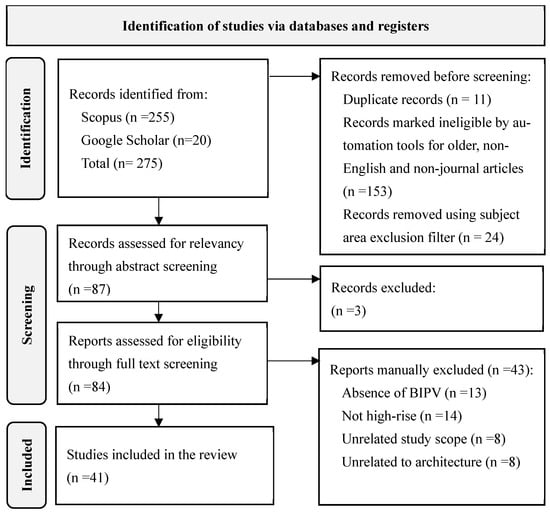 A Boolean search string was developed to identify relevant literature on BIPVs in high-rise buildings. The search employed keywords such as “BIPV façades,” “high-rise buildings,” “energy-efficient design,” “solar energy,” and other related terms to ensure a comprehensive coverage of the topic. In the Scopus database, the specific search string applied was TITLE-ABS-KEY ((“high-rise buildings” OR “tall building” OR “skyscraper” OR “multi-story building”) AND (“building-integrated photovoltaic” OR “BIPV” OR “solar energy” OR “façade-integrated photovoltaic” OR “solar building envelope” OR “photovoltaic façade”)). This initial search yielded 255 documents. The Boolean terms were carefully chosen to capture studies addressing both BIPVs and high-rise buildings. Multiple synonyms and related phrases were included to account for variations in terminology across the literature, ensuring the results were both comprehensive and focused. Furthermore, a manual selection of relevant papers from Google Scholar was undertaken, increasing the total number of identified studies to 275.