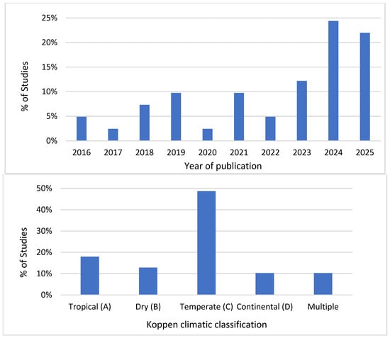 Distribution of the reviewed studies in terms of year of publication, climatic context, and high-rise building typology.