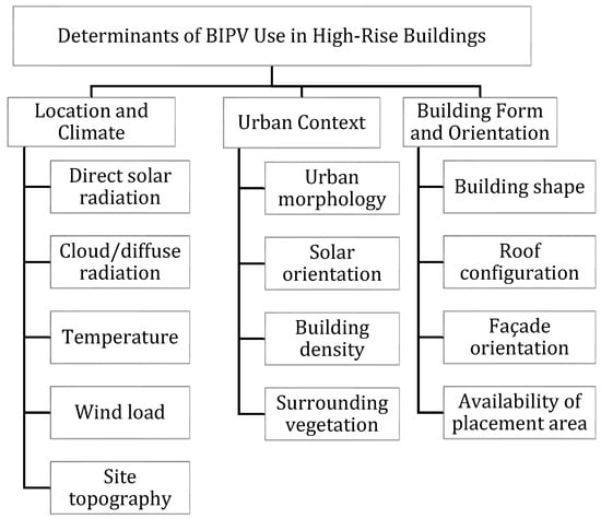 High-rise buildings are typically situated in dense urban settings. The potential for façade-integrated photovoltaic systems often far exceeds that of rooftop PV installations, due to the extensive surface area of façades compared to roofs, which are frequently occupied by utility and service systems. A review of existing studies reveals key themes that are critical when designing BIPV systems in high-rise buildings. These include external and environmental influences, urban context, location-specific factors, climatic conditions, and the building’s form and orientation. Recognizing and considering these overarching themes provides a foundation for assessing solar exposure, energy performance, and the feasibility of BIPV integration in complex urban environments. Understanding these external and environmental influences and their relationship to building design, is an important first step in evaluating how photovoltaic systems can be effectively incorporated into tall buildings (Figure 4).