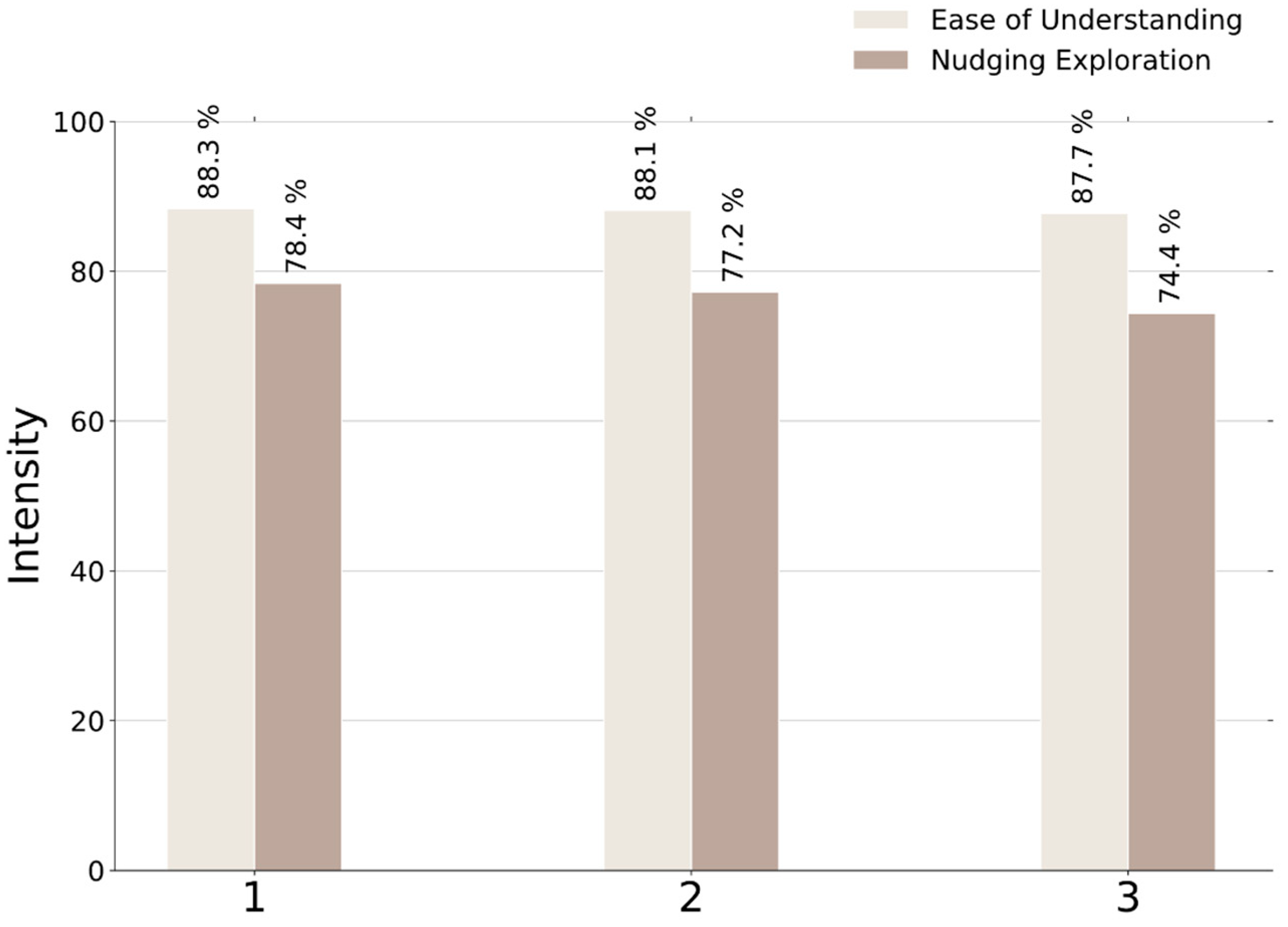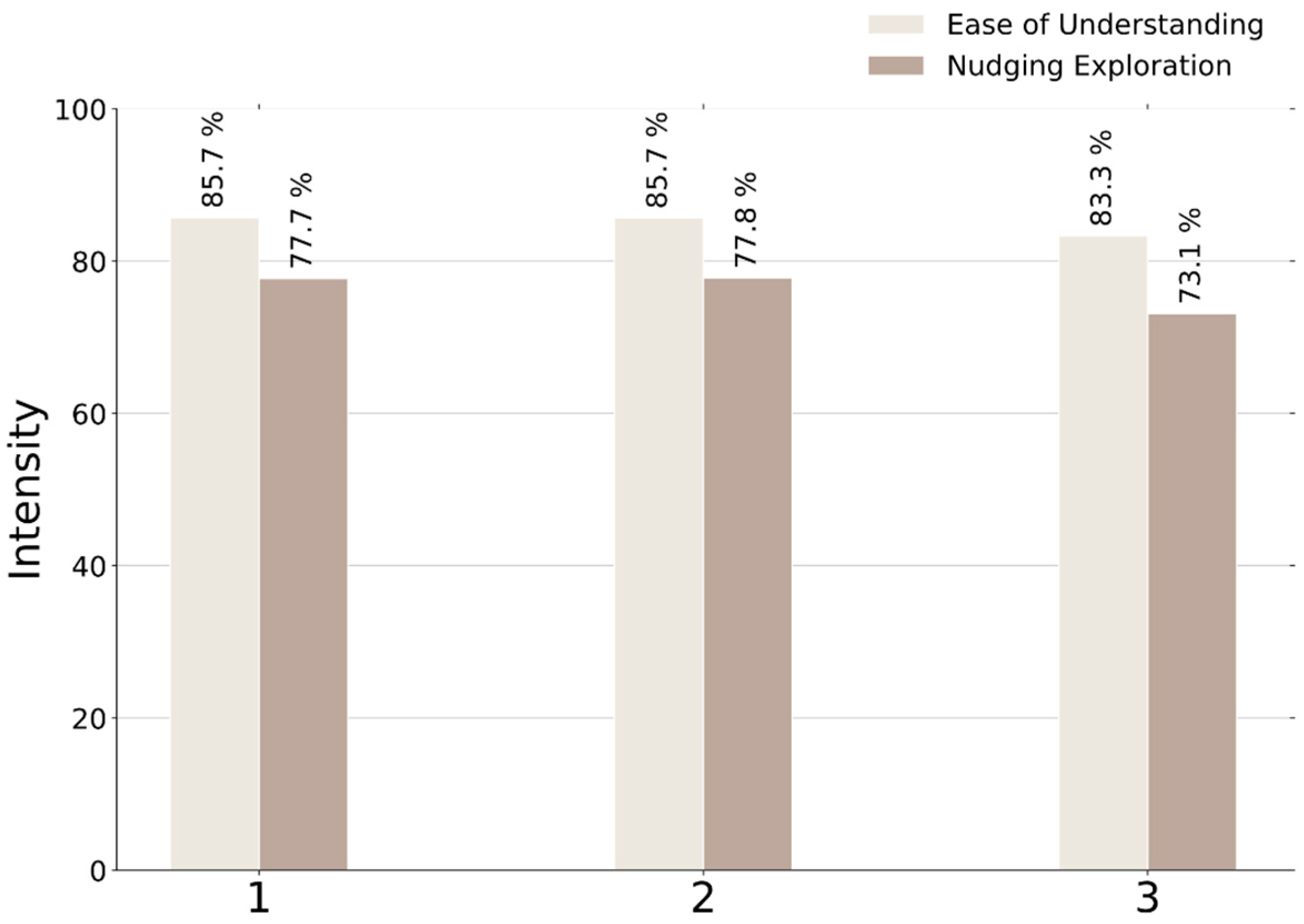 Third paragraph: The environmental preference results demonstrate positive outcomes across all the evaluated aspects, with minimal variations between the two settings and among the three POVs. The average values ranged from 73.1% to 88.3%, indicating substantial appreciation of the environment. Values for Ease of Understanding (average of coherence and legibility) are consistently higher than those for Nudging Exploration (average of complexity and mystery), a pattern stable across all POVs in both real and virtual conditions. This suggests participants found the environment easily comprehensible, facilitating orientation and interaction with the surroundings. Although less pronounced, the environment also stimulated participants’ curiosity to explore further. Reactions were similar across all POVs, indicating the experience remains consistent regardless of viewpoint. Values for each POV are closely matched between real and virtual conditions, with virtual evaluations generally yielding higher values, except for Nudging Exploration at POV 2.