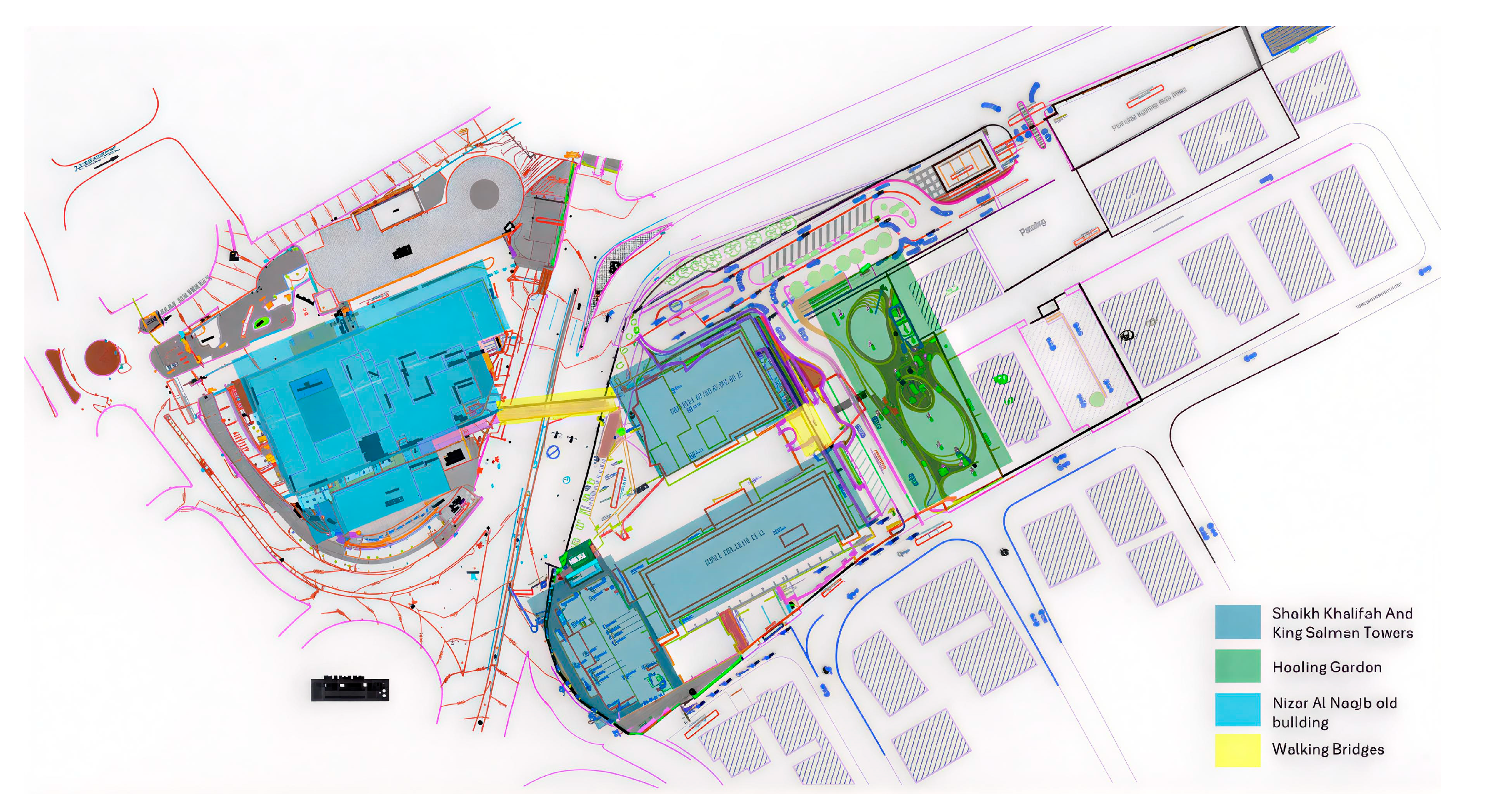 - Greenery: Gastrointestinal cancer patients experience a lot of stress and discomfort because of their overall physical well-being. Such symptoms are noticed in hematological cancer patients who cannot spend time in large communal outdoor spaces but could still benefit from visual engagement with nature. In early stages, patients are still able to walk through green areas or even past green walls to feel the connection with nature. Nevertheless, in late stages, where patients are bedridden, green views from windows are required. Some procedure rooms and some inspection rooms have green views on the ceilings to provide a sense of peace and emotional relief.