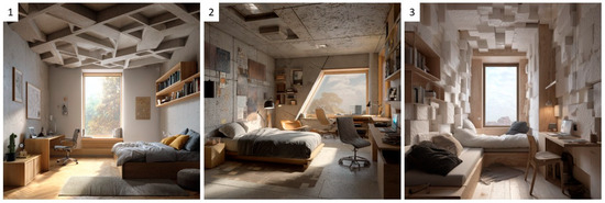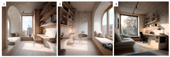 Figure 4 illustrates three iterations of interior design for a student’s room, incorporating metaphysical architectural characteristics while maintaining neutral colors and a connection to the landscape through spacious architectural openings. The renders were generated by the author.