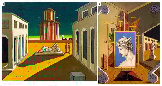 Metaphysical art: Famous paintings by Giorgio de Chirico— (1) the “Enchanted spaces in the city of Nietzsche” and (2) the “Metaphysical interior with the head of Mercury “, 1969. Both paintings incorporate triangles and trapezoids, which are metaphysical elements. Triangular compositions create a strong visual effect as a symbol of perfection and balance and give dynamism to the whole scene [49].