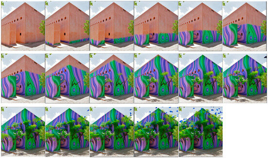This is the first option of the second level of intervention in designing architectural space for special neurological needs, especially ADHD and Misophonia. As exhibited in Figure 5. the keyframes extracted from a short AI-generated video created using Hailou software (https://hailuoai.video/, NANONOBLE PTE. Ltd., Beach Road Gateway East, 189721, Singapore. Unique Entity Number: 202410771D) from a visual and a textual prompt. These keyframes depict alterations to the physical properties of the famous minimal-architecture building, the Neundorf House in Spain, which offers a clean canvas for varied VR and/or AR scenarios. In this case, following a biophilic design expressed in reaction–diffusion nature-inspired patterns and employing the color palette of green and blue, which are known as stress-relief colors, as mentioned above. (The video was generated by the author.)